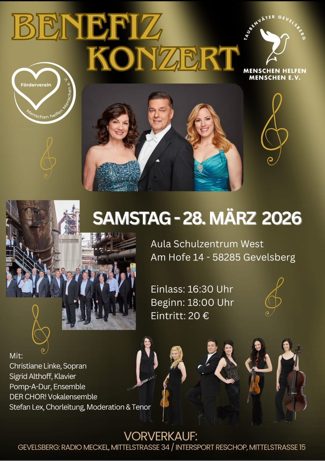 Für alle, die uns bald möglichst wiedersehen und wiederhören möchten, möchten wir auf das Benefizkonzert von „Menschen helfen Menschen e. V.“ der Taubenväter Gevelsberg am 28.03.2026 hinweisen.